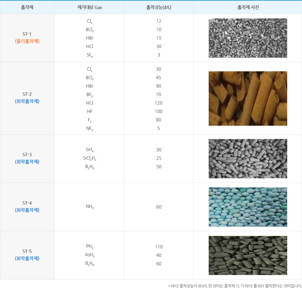 - 반도체, LCD, LED, Solar Cell 및 화학공정 등에서 발생하는 독/가연성 Gas를 상온 조건에서 접촉시켜 제거하는 고형분의 소재