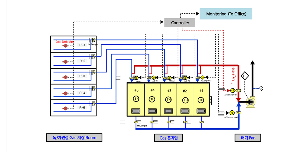 최근 유독성 가스의 누출 사고로 인한 인명 피해 및 재산상의 피해가 증가하고 있습니다. 당사는 유독가스에 대한 안정적인 처리 시스템을 개발하여 저비용으로 안전 대책이 가능한 Emergency 배기 흡착 시스템을 납품하고 있습니다.